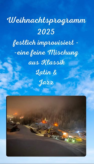 Ich präsentiere - Latin Jazz and more - in 2 Teilen (Jazzstandards), ein Weihnachtsprogramm und eine Lektion zur Jazzkadenz II-V-I. Einzelheiten bitte unter dem Button Programme einsehen.